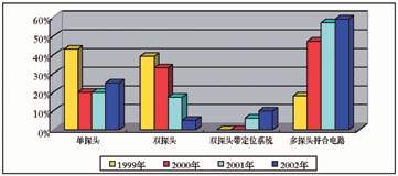 圖1 所示從1999年到2002年(2002年的數據是由上半年數據推算而來)單探頭、雙探頭、雙探頭帶定位系統和多探頭符合線路,四種不同核醫學設備每年各種類型所占比例?梢钥闯觥W顬槊黠@的是普通雙探頭在2002年僅僅占總數的5%,普通單探頭占總數25%,多探頭帶符合電路系統占總數59%。普通雙探頭帶X線定位系統占總數10%。可以看出單探頭SPECT和多探頭符合電路系統呈增長趨勢,尤其以多探頭符合電路系統更為明顯。