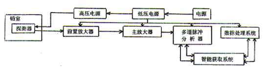 能譜數據獲取與處理系統:由ADC智能獲取接口和計算機組成。探測器到ADC行!獢缔D換,智能獲取接口對ADC的每個復換碼進行實時處理、顯示、數據壓縮,并每隔一定時間將已壓縮的數據由接口傳送至計算機,已進行譜顯示的更新,每個譜的長度、寬度、停機方式和條件,起、停都由計算機獨立控制。在測量過程中,計算機可以停機或處理其它數據。